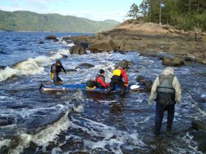 After 2 hours of the Saguenays fury someone up ahead spied a beach, but there was no lee, we would have to go in riding the breakers and hope for the best. We had to get out, we needed food & water. No one has been able to take their hands off the paddle long enough to drink and Danny who has the map doesnt even dare look down to try and see where we are. I dont know for sure who the brave soul was who went in first (I think it was Danny) but they got ashore and directed the next one in through the rocks. With two on shore they waded waist deep in to stabilize and help the others ashore. Dean almost capsized on the way in as he hit a rock.